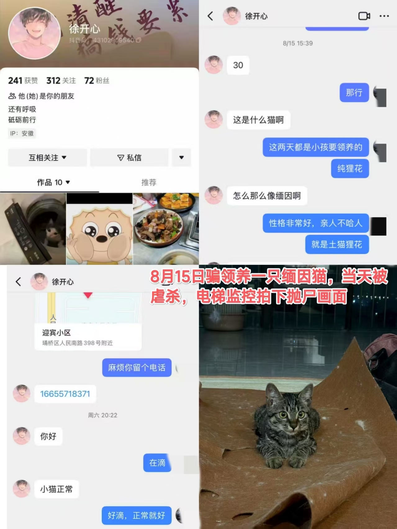 "On August 15, he adopted a Maine Coon cat (editor’s note: actually a tabby cat resembling a Maine Coon). The cat was killed the same day, and elevator surveillance footage captured the disposal of the body."