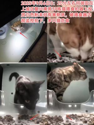 At approximately 00:20 on September 6, 2025, He Run Tian allegedly placed a toxic white powder inside a public "street cat" automatic feeder located at Building 39 of the Fuxing Nanyuan residential complex (复兴南苑39栋) in Shangcheng District.[1] He later reportedly bragged about the poisoning in a QQ group. Activists have also alleged that he has created and shared videos on Douyin demonstrating how to prepare poison for cats, and that surveillance footage from the feeder captured three cats consuming the tainted food.[1]